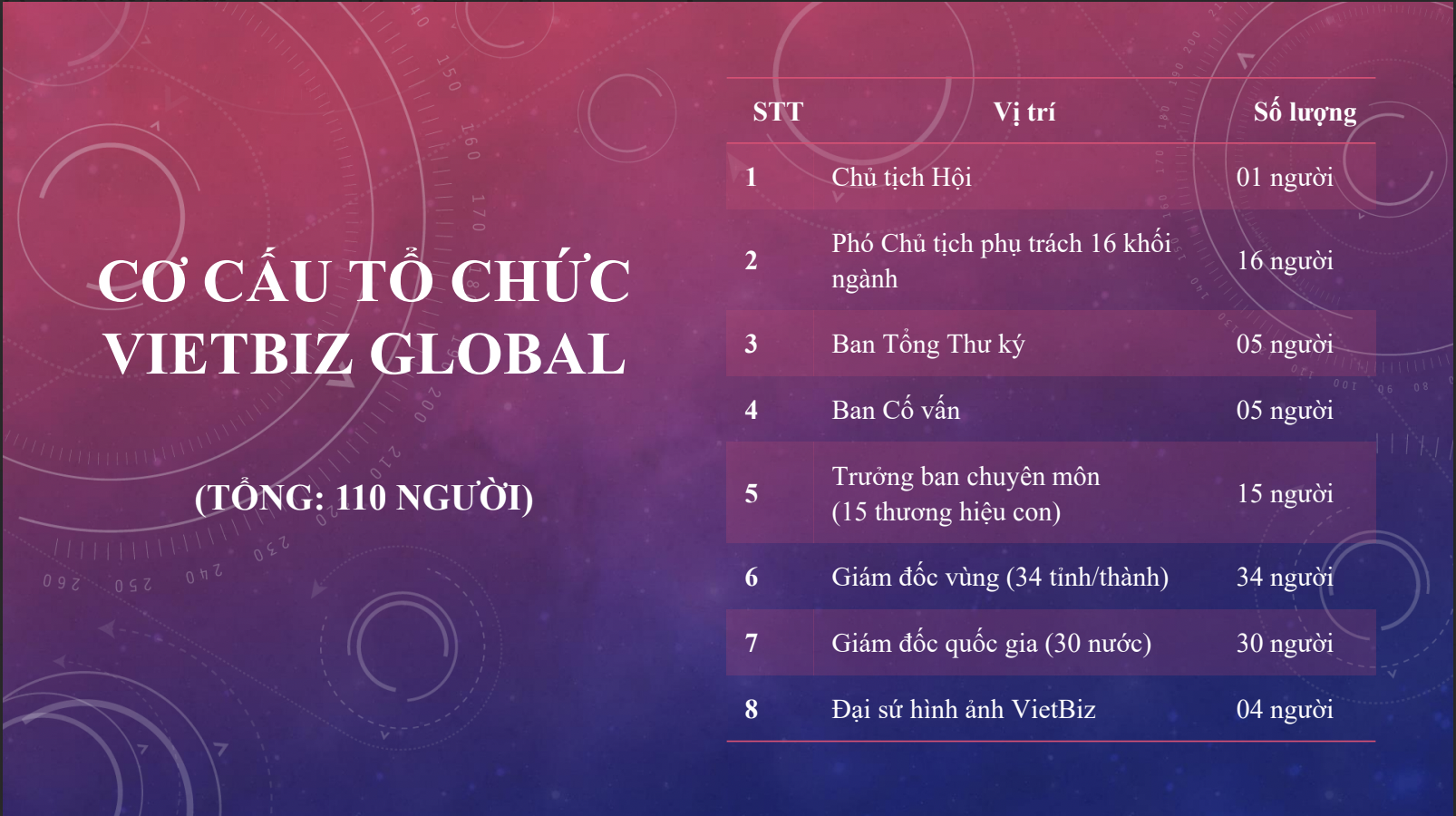 Với cơ cấu tổ chức chuyên nghiệp, VietBiz Global khẳng định vai trò là đầu mối kết nối doanh nhân Việt trên toàn cầu, đồng thời là nền tảng phát triển tri thức và hợp tác kinh tế số.