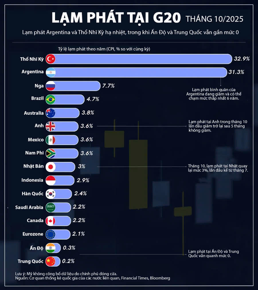 Lạm phát tại nhiều nền kinh tế G20 đang có xu hướng hạ nhiệt, trong đó Ấn Độ và Trung Quốc duy trì mức lạm phát gần 0%. Diễn biến này phản ánh nhu cầu tiêu dùng còn yếu và tạo dư địa cho các chính sách tiền tệ nới lỏng, song cũng đặt ra lo ngại về nguy cơ giảm phát và tăng trưởng trì trệ.