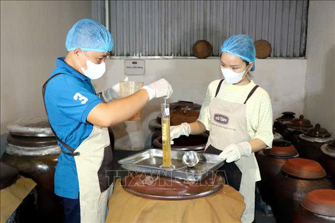 Anh Vũ Minh Ngọc kiểm tra quá trình lên men của giấm. (Ảnh: TTXVN)